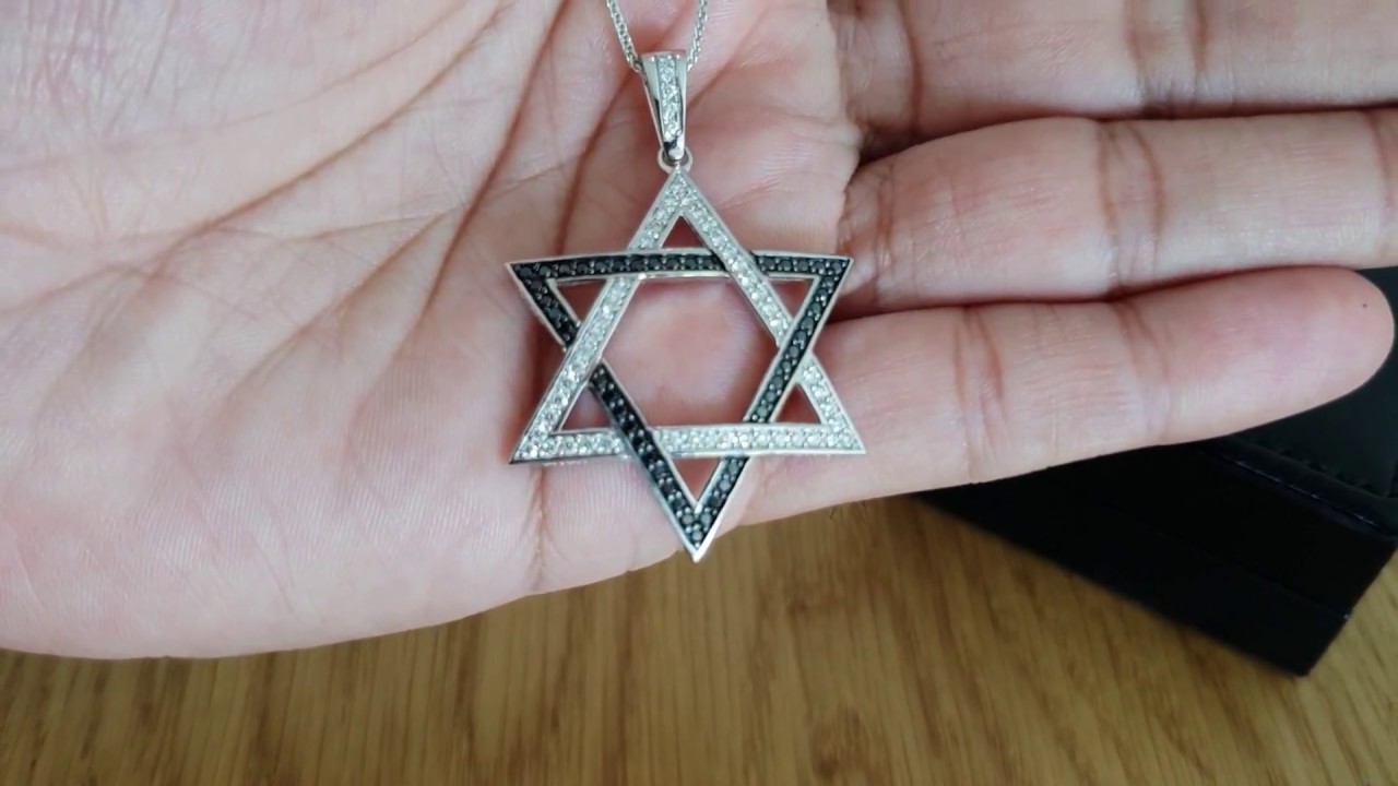 צפו בתליון מגן דוד גדול משובץ יהלומים שחורים ולבנים בתנאים אמיתיים, כולל הברק, הפרופורציות ואיכות הגימור