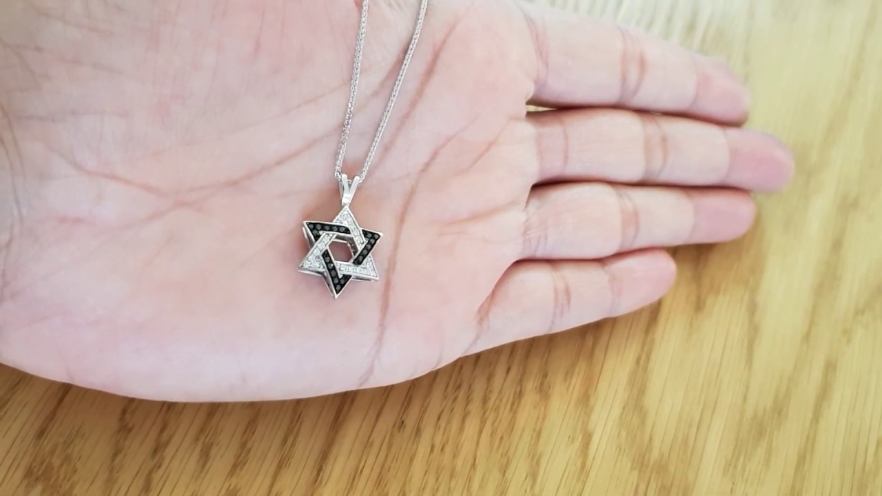 צפו בתליון מגן דוד תלת מימד יהלומים שחורים ולבנים, 1.7סמ בתנאים אמיתיים, כולל הברק, הפרופורציות ואיכות הגימור