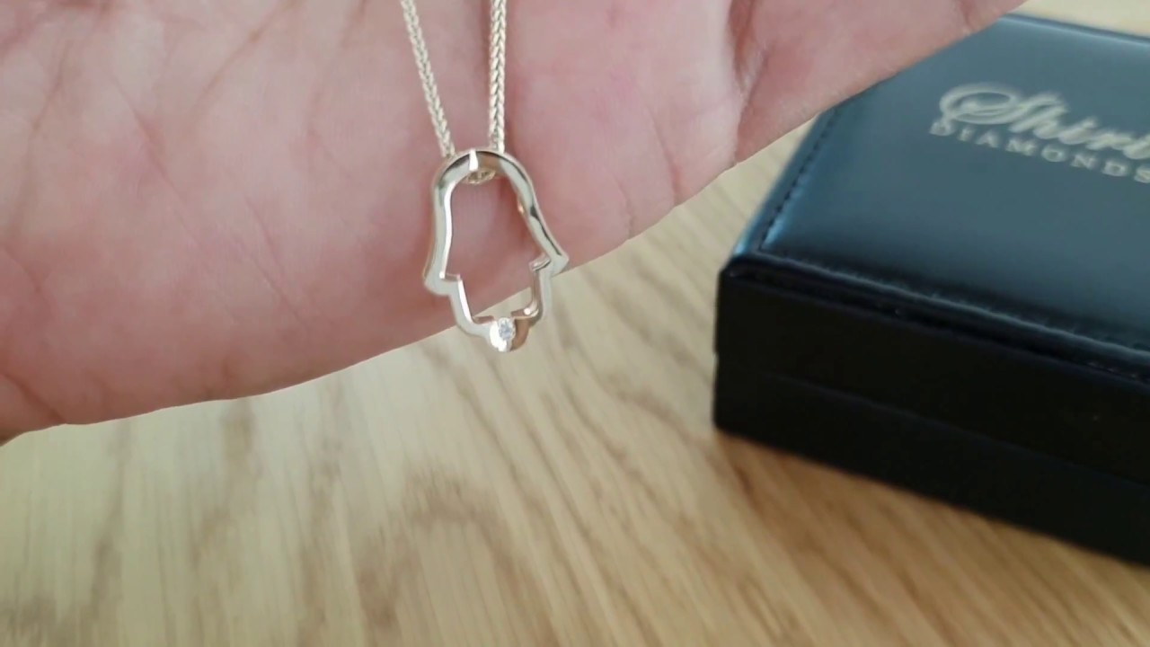 צפו בתליון חמסה מרחף 20 מ"מ זהב משובץ יהלום טבעי 0.03 קראט - עיצוב מודרני בתנאים אמיתיים, כולל הברק, הפרופורציות ואיכות הגימור