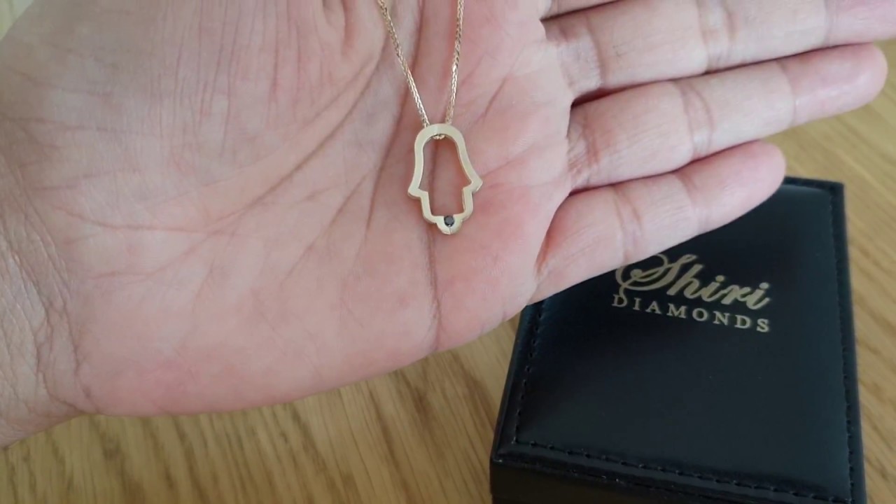 צפו בתליון חמסה מרחף 20ממ משובץ יהלום שחור בתנאים אמיתיים, כולל הברק, הפרופורציות ואיכות הגימור