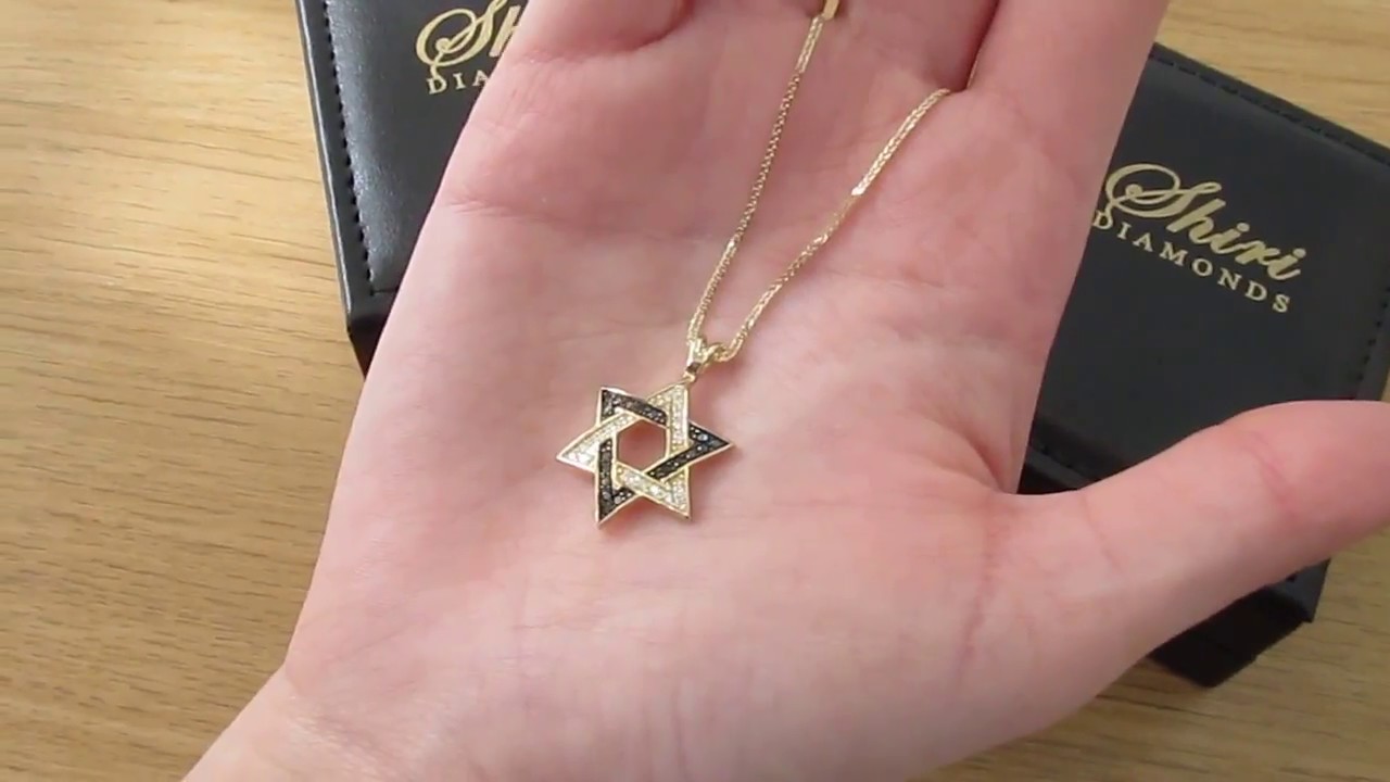 צפו בתליון מגן דוד זהב צהוב משובץ 36 יהלומים שחורים ולבנים, 2סמ בתנאים אמיתיים, כולל הברק, הפרופורציות ואיכות הגימור
