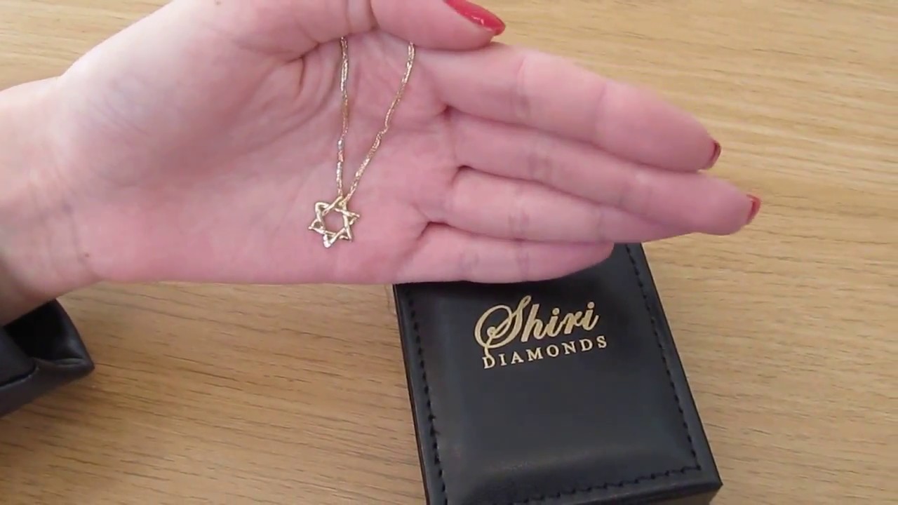 צפו בתליון מגן דוד תלת מימד מזהב 14K משובץ יהלום בתנאים אמיתיים, כולל הברק, הפרופורציות ואיכות הגימור