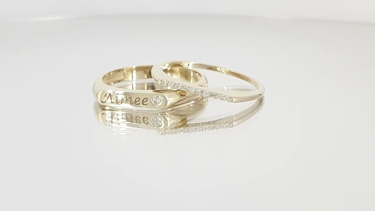 צפו בסט טבעות זהב אמיתי - טבעת שם עם שיבוץ לב וטבעת משלימה עם יהלומים בתנאים אמיתיים, כולל הברק, הפרופורציות ואיכות הגימור