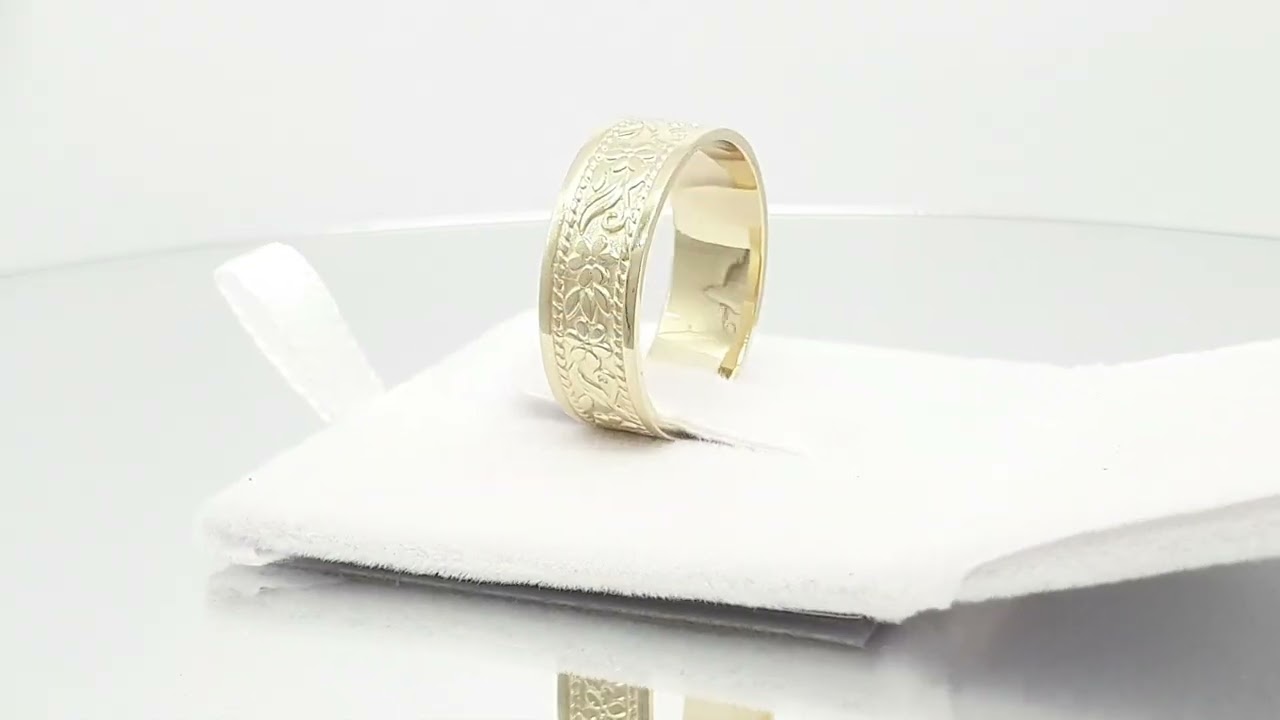 צפו בטבעת נישואין בסגנון עתיק - עיצוב אותנטי עם נוכחות ומרקם עשיר בתנאים אמיתיים, כולל הברק, הפרופורציות ואיכות הגימור